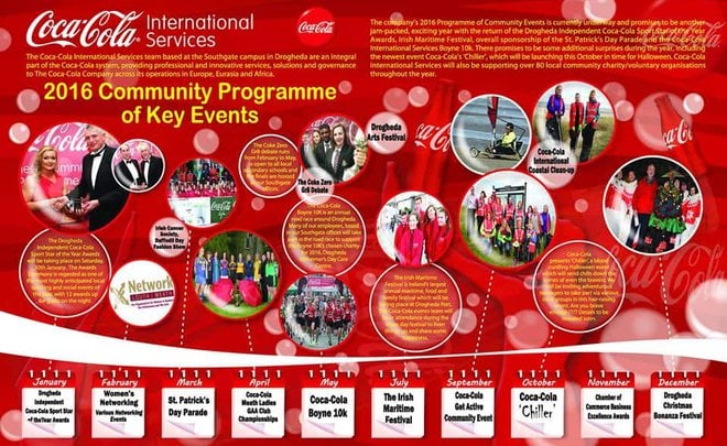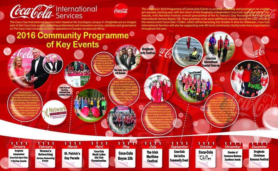 We were commissioned by Coca Cola International Services to create a double page advertising spread for the Drogheda Independent newspaper. The spread was to highlight all of the community events the Coca Cola would be involved in throughout 2016.