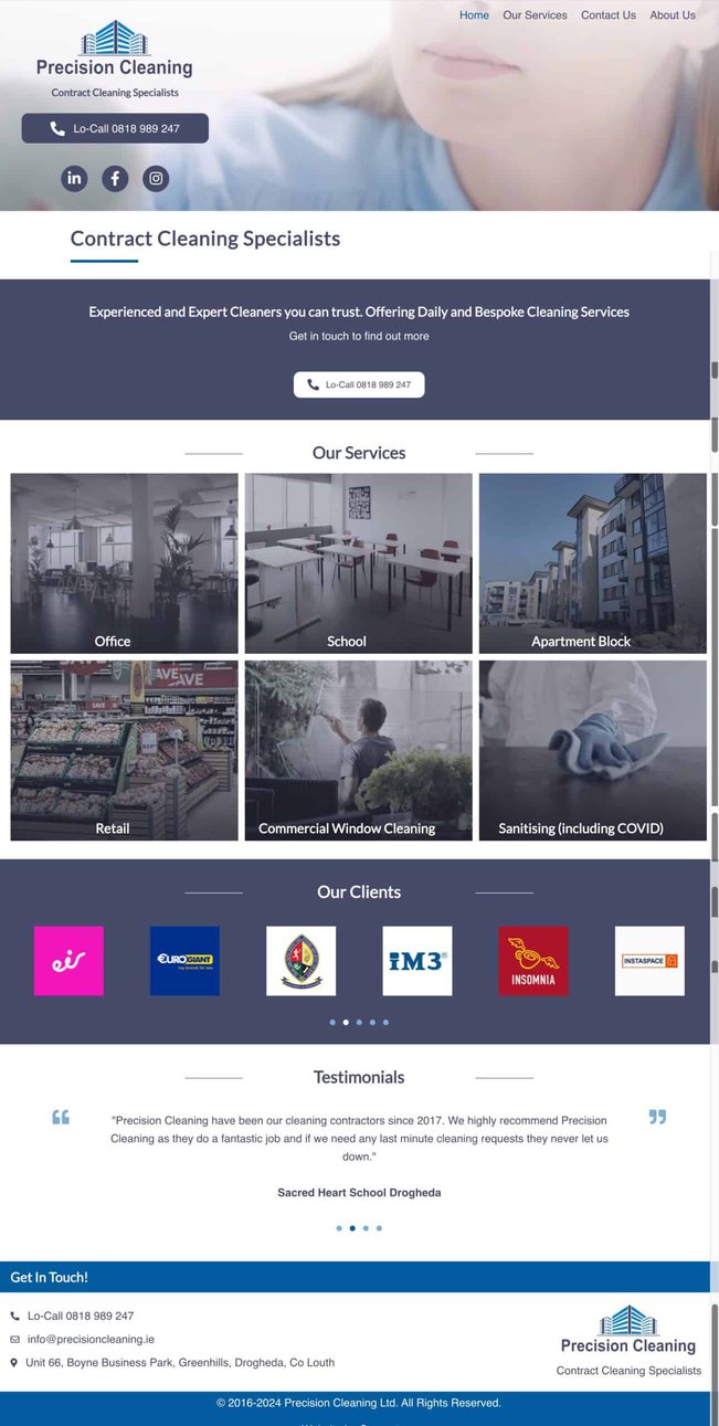 This is Precision Cleaning an already successful cleaning company run by Joe Dixon. Joe came to us with a request for a simple site that would showcase his business and inform his customers and potential customers about his services, how he operates and an easy call to action button to contact him.